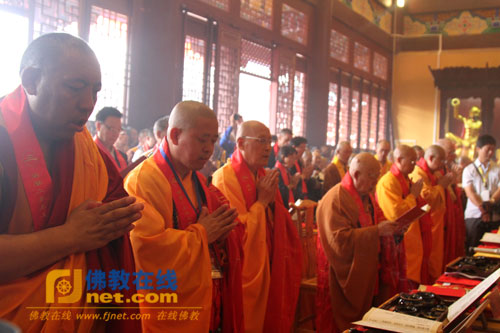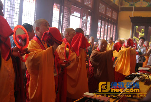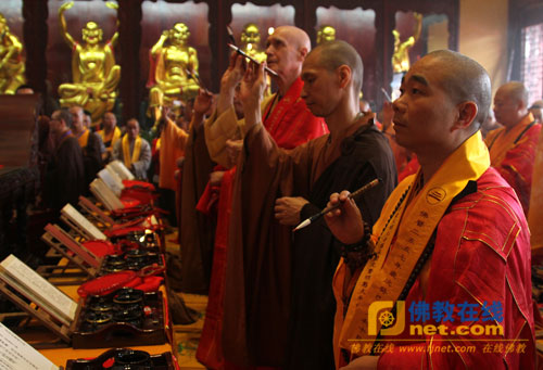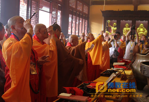随后,大开元寺落成开光法会在大雄宝殿隆重举行,海内外诸山长老在四众弟子的恭请下移步大雄宝殿,按照开光法会仪轨共同主法。诸位主法法师先瞻礼礼拜圣像后,在维那师的引领诵经声中共同拈香主法、持诵经文、香花请圣。而后,诸位主法法师提朱砂笔点向佛眼宣开光法语。法会现场香烟弥散、梵音袅绕、庄严殊胜,现场与会大众无不法喜充满。
