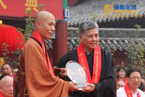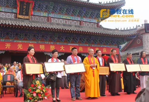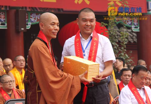 明海法师为大开元寺作出特殊贡献的功德主颁发功德牌,表彰其护持寺院、为大开元寺的落成所作贡献。杨勋代表功德主发表讲话。
