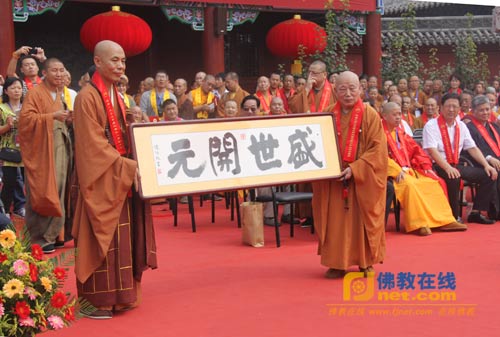 随后,各界人士向大开元寺赠送贺礼。中国佛教协会会长传印长老向大开元寺赠送墨宝“开元盛世”。明憨法师致答谢词,就各界人士一直以来对大开元寺的支持和帮助表示感谢。