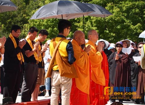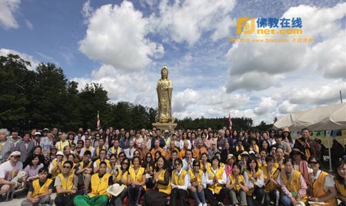 佛教在线海外讯 为了弘扬观世音菩萨慈悲济世的精神,加拿大佛教会湛山精舍于2013年8月11日在加国普陀山隆重举行第二次护生祈福法会,九十岁高龄的性空长老莅临此次盛会,另有约近四百位信众参加了法会。位于加国普陀山观音道场,占地200英亩,依山傍水,承袭了中国浙江普陀山风景韵味。加国普陀山现有三尊观音像,其中由中国浙江普陀山佛教协会赠送的4.9米高的南海观世音菩萨像,在阳光的辉映下闪烁着金色的光芒。