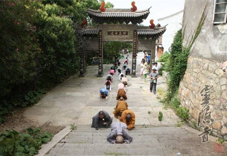 当日上午,光泉法师一行到达普陀山之后,即由山门开始,三步一拜,沿着朝山的古道,一路拜至普济寺。无论是火辣辣的太阳所带来的僧衣皆湿的不便,还是崎岖蜿蜒山路所带来的身体上的伤痕,无论是3小时叩拜朝山所致的身体上的劳累,还是沿途游人异样的目光,都未能阻止这群朝山人心中那份坚定的信愿。