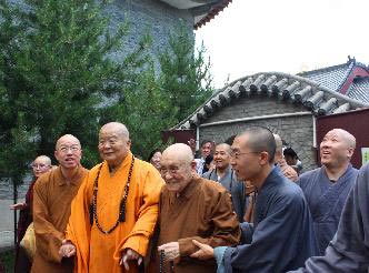 佛教在线五台山讯 2013年7月6日,星云大师朝圣五台山文殊菩萨道场,并专程前往普寿寺向高龄99岁梦参长老拜寿。两位老和尚一见面,双手紧握,彼此搀扶,艳阳高照的天空立即洒下甘露。梦参长老与星云大师相互赞叹,禅机不断,众人法喜充满。
