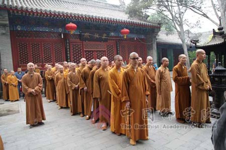 参访团在教务处副主任觉灯法师、2009级班主任妙戒法师的带领下,于2013年6月2日8时从中国佛学院出发,出发前全体参访团成员云集大雄宝殿礼佛告假。