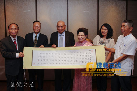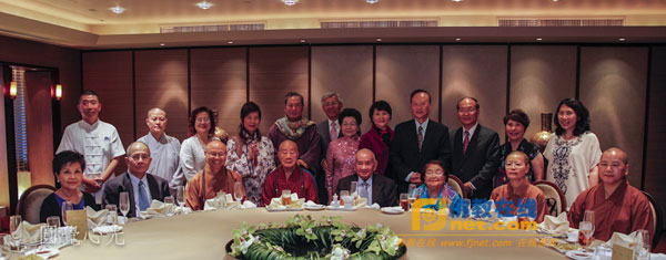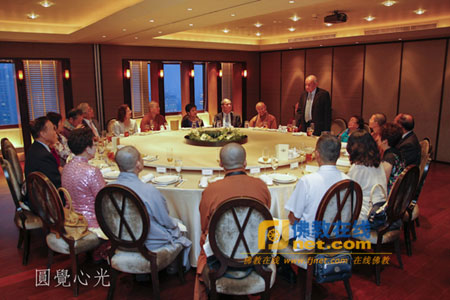 当日晚于世贸国誉厅宴请举行了隆重的欢迎晚宴,台湾中华佛寺协会创会会长、前台湾中国佛教会理事长净良长老,佛光山心定法师、满和法师等出席晚宴,台湾中国佛教青年会理事长明毓法师等人做陪,梵瓦那美第会长一行对大家的热情接待表示由衷感谢,双方互赠礼品并合影留念。