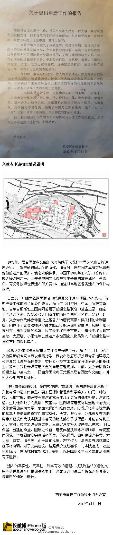 佛教在线西安讯 埋有唐代著名高僧玄奘法师灵骨的西安兴教寺因为丝绸之路联合审议的原因要拆除僧寮、三藏院回廊等建筑。消息传出,许多僧众、居士以及游客误以为要拆除整个兴教寺。2013年4月11日下午,西安兴教寺已经将退出申遗的报告递交西安长安区文物部门。