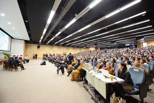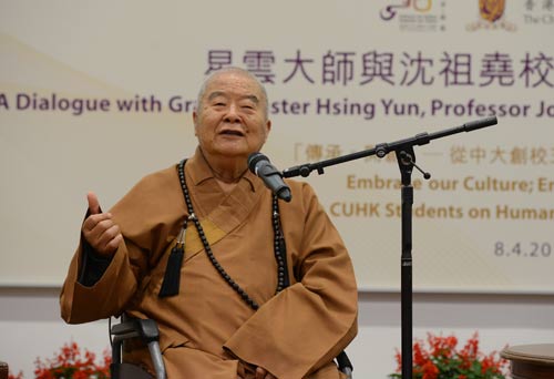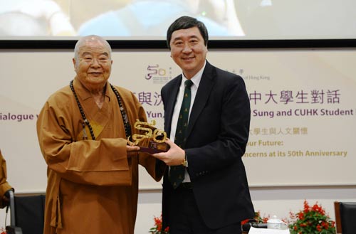佛教在线香港讯 今年适逢香港中文大学(中大)金禧校庆,佛光山开山宗长星云大师应邀于2013年4月8日莅临校园,以“传承、开创──从中大创校五十年看大学生人文关怀”为题,与校长沈祖尧教授及中大学生作深入的探讨。活动的反应非常热烈,演讲厅近600个座位全部爆满,不少出席者更于场内席地而坐,以一睹大师的风采。大学又于另一讲堂提供视像转播,以容纳不断慕名而来的听讲人士。