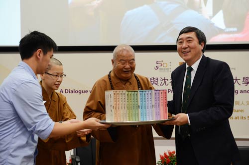 星云大师送赠其最新著作《百年佛缘》予沈祖尧校长