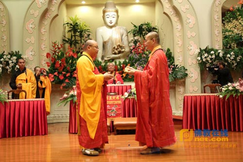 星云大师亲自传受信物予台北市佛教会理事长明光法师为临济宗第49代、佛光山第二代法子(图:人间社 陈碧云)