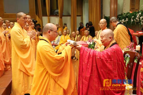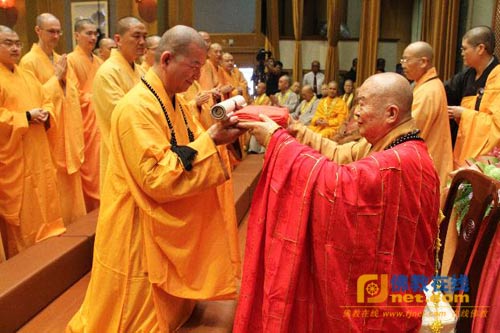 佛光山第九任宗长心保法师由开山宗长星云大师手中领受法卷(图:人间社 慧延法师)