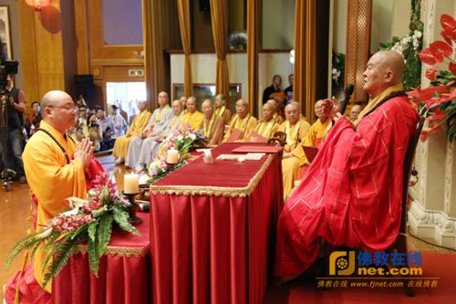 法子净耀法师敬呈用二十五万朵莲花制成的百福袈裟予星云大师,他表示,很荣幸在星云大师钦点下,承接大师的人间佛教教法,恩德无以回报,期望星云大师使用后能供在佛馆,化个人拥有为众人拥有,更有意义。