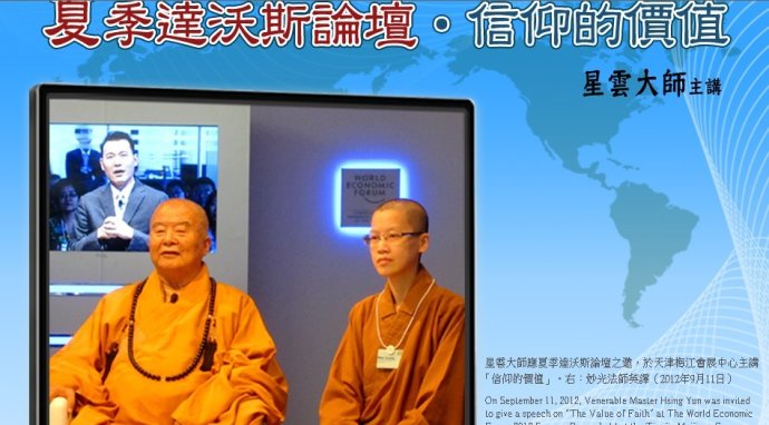 二○一二年九月十一日下午,佛光山开山星云大师应「第六届夏季达沃斯论坛」(世界经济论坛)之邀,於大陆天津梅江会展中心主讲「信仰的价值」,成為该论坛创办四十二年来,第一位应邀发表专题演说的佛教领袖。主办单位表示,由於经济高度发展,人们开始注重经济财富之外的心灵、公益层面,设立「洞察力‧新观念」主题,特邀大师讲说「信仰的价值」。讲演后,大师并应邀出席开幕式,包括大陆总理温家宝等七位国家元首,及八十六个国家、二千餘人与会,创下歷届参加人数最多的纪录。