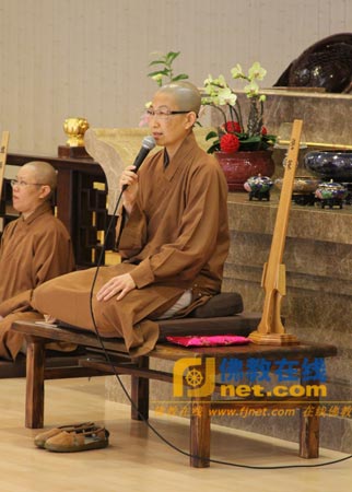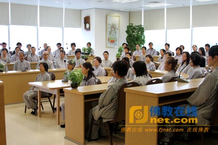 当天下午品茶,聆听香港佛光道场住持满莲法师为众开示。满莲法师表示,修行最重觉照力,慈悲分析品茶与参禅相应之道,启发大家体验茶的苦味,应警觉世间众苦的困扰、烦恼的源头,勿任外境干扰心境。如能观照审查内心,克服外境的干预,苦自无容身之地。再者,茶性是苦亦是甘,法师指导大家通过审察茶性观照自心,学习放下固有观念,就人生和事物的价值观寻求突破,培养刻苦能力,不受外境或身体苦楚障碍;指出与其将专注力放在打坐腿麻或生活烦恼上,不如转变心念;时刻保持觉醒,把握每一个当下,随处也可以修禅。漫长人生其实是短暂,把握当下,不让人生白过。