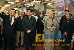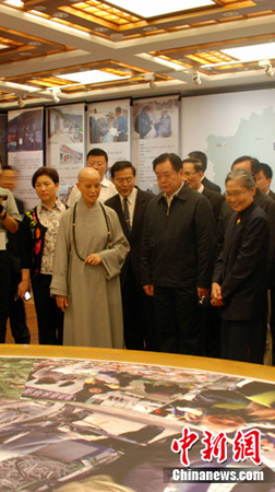 5月24日,四川省人民政府省长蒋巨峰一行在证严法师的陪同下参观了位于台湾花莲的慈济静思堂。证严法师赞四川地震救援是“尊重生命的”,“希望与大陆更有缘”。图为蒋巨峰(右二)在证严法师陪同下参观慈济静思堂四川震灾区的展厅