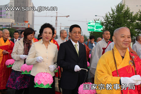 蒋坚永副局长参加莲灯庆典活动(左首为吉林省宗教局姜光子局长,右首为中国佛教协会副会长明生法师)