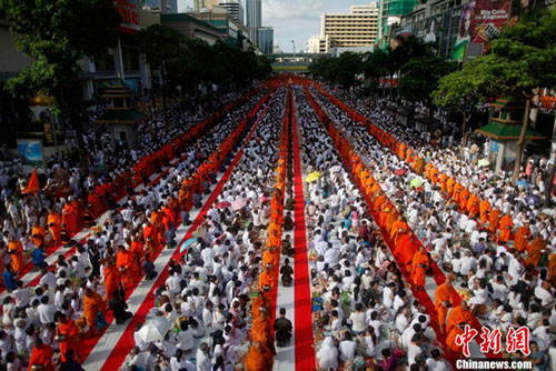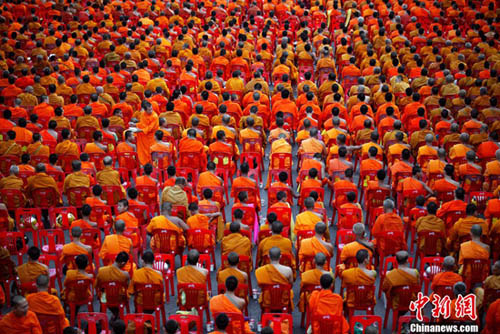 保定佛教资讯转 佛教在线海外讯 2011年5月8日,12600名僧侣聚集在泰国曼谷一起庆祝卫塞节。卫塞节是南传佛教纪念佛教创始人释迦牟尼佛祖诞生、成道、涅盘的节日。