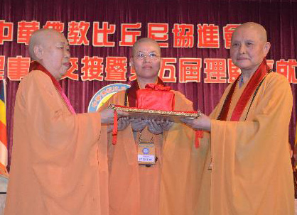 随后,大会进行新旧任理事长的会旗、印信交接典礼,并赠送匾额等礼物祝贺新任理事长普晖法师。普晖法师表示,“成立比丘尼的组织,是为了提升僧尼的素质,也是僧尼的窗口,今后能与诸山大德共同成长。”