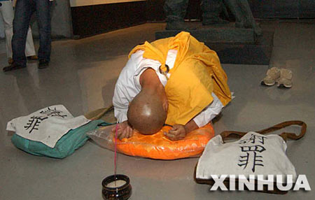 图为2006年5月11日,日本僧人岩田隆造在哈尔滨侵华日军第七三一部队罪证陈列馆的活体试验展厅为侵华日军的当年恶行谢罪。 (图片来源:新华社 摄影:王茜)
