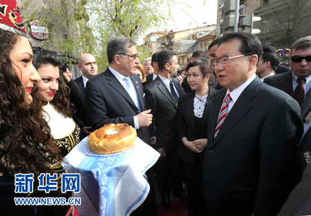孔子学院的亚美尼亚学生向李长春献面包和盐