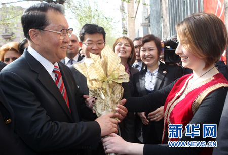 17时许,李长春来到埃里温国立语言大学,与前来迎接的校长佐良亲切握手。100多名该校孔子学院师生代表挥舞两国国旗,热烈欢迎中国贵宾的到来。