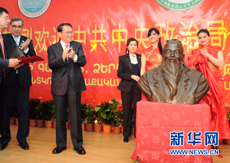 随后,李长春与亚美尼亚文化部长波戈相一起为孔子铜像揭幕,并与学习汉语的亚美尼亚学生进行了亲切交谈,观看了孔子学院学员们的汇报演出。学员们表演的中文诗歌朗诵、武术和太极拳等,赢得了中国贵宾们的阵阵掌声。
