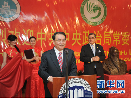 李长春说,在两国政府的关心和支持下,埃里温国立语言大学孔子学院于2008年10月设立,为当代两国人民的友好交流架起了新的桥梁。我们高兴地看到,虽然孔子学院办学时间不长,但受到了亚美尼亚学生和民众的欢迎,成为亚美尼亚青年学习汉语、了解中国文化的重要窗口,成为两国人民加深了解、增进友谊的重要平台。