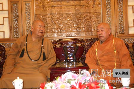 星云大师与传印长老进行亲切友好的会谈。(图片来源:凤凰网华人佛教)