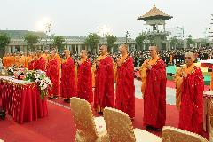 当主法和尚入席,大众收摄身心双手合十迎请法师,由佛光山住持心培法师等九大师及200余位法师带领大众修持,南区各道场108 位优婆塞、优婆夷共同庄严坛场。