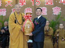 为欢迎星云大师的到来,该校艺术学院院长林振阳教授特别准备“宝瓶”艺术花瓶献给星云大师。林振阳院长指出,该“宝瓶”是由应用艺术与媒体艺术学系的学生在老师指导下共同完成的作品,完全是以手工将木片一片一片制作而成,藉此象征著百万人兴学之意义,取名为“宝瓶”,更是祝福星云大师与全校师生永保平安。