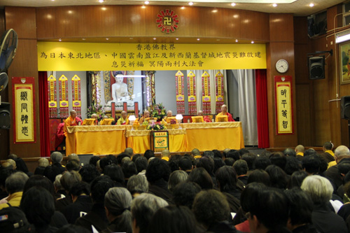 保定佛教资讯转 佛教在线香港讯 连日来,新西兰基督城、中国云南盈江及日本东北部接二连三发生地震,其中日本东北部发生该国有史以来最强烈的9级大地震,地震触发起滔天海啸,瞬间淹没多个县市,伤亡惨重,核电厂及地区设施遭受严重破坏,灾民丧亲毁家外,还备受核辐射威胁。为对灾民表达深切的关怀,及向罹难者表达沉痛的哀悼,香港佛教联合会于2011年3月16日晚在香港佛教联合会文化中心举行了“为日本东北地区、云南盈江及新西兰基督城地震灾难启建息灾祈福冥阳两利大法会”,广邀全港诸山长老恭诵《地藏菩萨本愿经》,祈求罹难者往生莲邦,鼓励灾民坚强面对苦难,重拾生机。