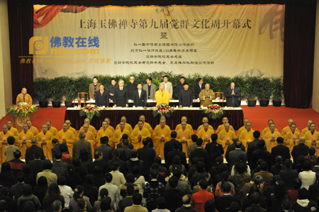 保定佛教转佛教在线上海讯 2010年11月27日上午,上海玉佛寺在觉群楼多功能厅隆重举办了第九届“觉群文化周”开幕式。上海市民宗委副主任沈国强,普陀区人大常委会副主任曹玉茂出席了开幕式;上海图书馆馆长吴建中,中国艺术家协会名誉主席顾浩君,中国佛教协会副会长、上海市佛教协会会长、玉佛寺方丈觉醒法师,上海市佛教协会名誉会长妙灵长老、副会长周富根等领导,以及复旦禅学社的师生代表,觉群学院历届校友,觉群书友会的会员代表,玉佛寺法师,居士约600余人参加了开幕式。
