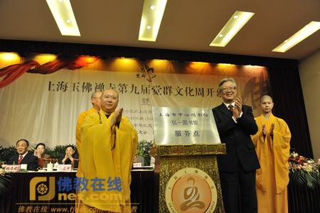 开幕式上,上海中心图书馆与玉佛寺弘一图书馆举行了网络资源链接启动仪式,这样,以后就可以在玉佛寺网站上即可直接查阅到上海中心图书馆的馆藏书目,在上海图书馆同样也能查阅到弘一图书馆的馆藏书目,从而极大地方便了读者的需要。作为两家图书馆深度合作的项目之一,弘一图书馆自即日起还将成为上海中心图书馆“一卡通”工程的服务点,是上海市乃至全国首家可以实现与市级中心图书馆通借通还的佛教图书馆。吴建中馆长和觉醒法师共同为“上海中心图书馆弘一图书馆服务点”揭牌。