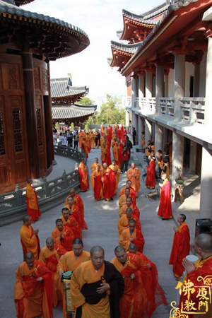 9点50分,钟鼓齐鸣,太平岩寺住持世澄法师领众在山门外热情迎接新加坡法照法师一行的到来。法照法师拈香后,法云法师、世澄法师陪同法照法师到太平岩寺大雄宝殿隆重举行斋僧植福祈安法会。参加斋僧法会的一百多位法师分别在大雄宝殿礼药师普佛,在法堂恭诵《药师经》、药师咒、称念药师佛圣号。佛事结束后,世澄法师领众过堂,新加坡护法居士如法供养三宝。