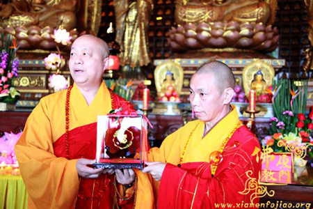 厦门市佛教协会副秘书长、太平岩寺住持世澄法师向法照法师赠送礼品