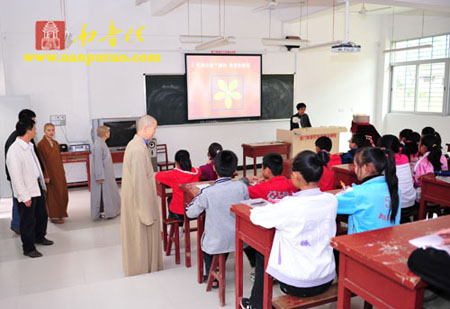 捐赠仪式上,德鸣法师嘱咐教师利用好先进教学设备,提高教学水平,并鼓励学生,珍惜良好的学习环境,努力学习,将来回报社会。仪式结束后,德鸣法师一行又参观了已安装好并投入使用的多媒体教室。