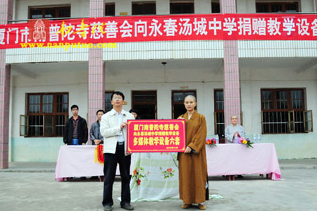 保定佛教转佛教在线厦门讯 2010年11月23日,受厦门南普陀寺慈善会会长圣辉法师嘱托,德鸣法师、演传法师、静仁法师一行到福建泉州市永春县汤城中学参加教学设备捐赠仪式。南普陀慈善会为该校捐赠6套多媒体教学设备,价值近17万元。