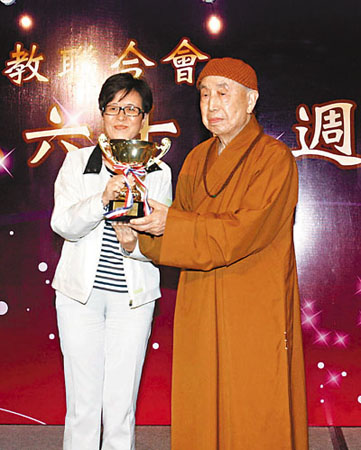 觉光长老(右)向慈善券筹款总冠军颁发奖杯。