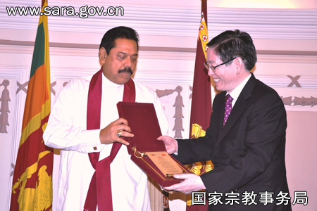 正如您刚所说,加强两国佛教之间的友好交流合作,对发展两国和两国人民的友好关系具有非常重要的意义,感谢您对斯里兰卡国际佛教文化苑中国风格寺庙援建项目的积极推动,希望能早日落成。中国驻斯里兰卡大使杨秀萍女士对这个项目也非常重视和关心,在此我也同样表示衷心感谢。会谈结束后,拉贾帕克萨总统向王作安局长颁发了由斯里兰卡佛教界提议授予的“宗教工作贡献奖”。