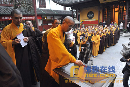 活动现场,排列整齐的法师,一袭亮黄的僧袍显得庄严而肃穆,低沉而悠婉的诵经声和法器奏出的声音传向天空,向逝去的英魂送去玉佛禅寺僧职员工的哀思,并通过念诵《弥陀经》的佛教特有形式带去僧职员工的祈愿:愿去世的同胞魂归极乐,早登莲地;愿生还者意志坚强,在政府和社会各界的支持下,战胜困难,早日恢复正常的生活。