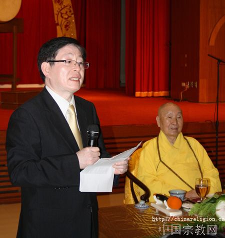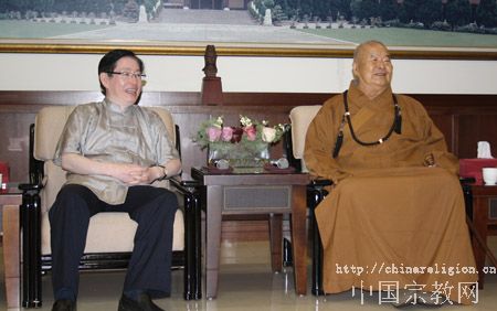 餐毕,星云长老说换一个地方说说话,遂引众人到一大厅,门开处,只见数百法师端坐台下静候,老人家则直接引王作安局长走上主席台。面对数百徒众,长老端然开言:“道安国师有言,不依国主,佛法难立。现代人说,没有规矩不成方圆。所以,不要以为方外之人就可以不敬王者不尊国法。我就很羡慕,大陆各级都有宗教局,有了他们,法事可立,出家人遇到了什么难事,他们都会帮助解决。”顺着长老的话头,王作安局长先向在座法师介绍了国家宗教局的性质和职能以及大陆佛教界目前面临的机遇和挑战,鼓励两岸佛教界多就宗教人才培养、寺庙财务管理、公益慈善事业等方面开展交流与合作。最后,王作安局长高度评价了星云长老近年在促进两岸宗教交流、推动两岸关系和平发展、增进两岸同胞福祉方面所作出的积极贡献。
