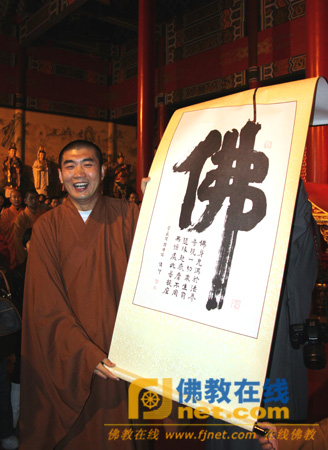 湛如法师展示传印长老赠送的书法作品