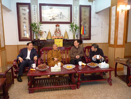 在会客厅,王宁局长向齐晓飞副局长介绍了温州历史上的四大古刹:嘉福寺、天宁寺、护国寺、太平寺。至今,太平寺、护国寺在党和政府的关怀支持下已落实宗教政策,并成为四众弟子修学的宗教活动场所和对外开放;同时,还介绍了温州佛教四众弟子高举爱国爱教、加强自身建设、以及创建和谐寺院等情况。齐晓飞副局长在提到社保问题时,智明法师表示僧人乐意参保,并将推动温州僧人积极响应国家五部门发布的《关于妥善解决宗教教职人员社会保障问题的意见》文件,让温州僧人老有所依、老有所养。