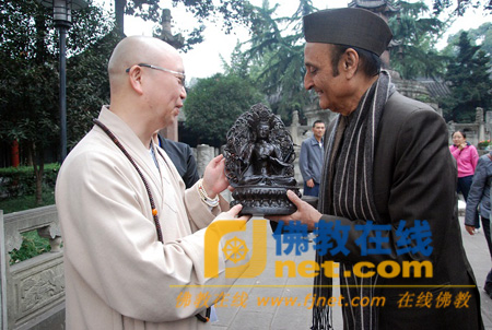 参观结束后,智海法师代表文殊院赠与卡兰·辛格主席一尊乌木的文殊菩萨雕像,卡兰·辛格主席回赠精美玉器以示友好与谢意。此外,印度驻华使馆官员也赠送《纪念中印建交60周年绘画艺术展》画册,缔结中印的友好纽带关系。