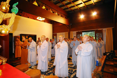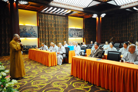韩国佛教天台宗朱正山长老首先对陈振华副主任和月真法师的热情接待表示由衷感谢。朱正山长老讲道,韩国天台宗的祖庭是中国浙江省国清寺,国清寺里有中韩祖师纪念堂,那里供奉着智者大师与在韩国开立天台教学的高丽义天大觉国师,及近代中兴韩国天台宗的中兴祖上月圆觉大师等三位的青铜坐像。同时,他指出促进中韩两国的佛教文化交流是韩国天台宗应尽的责任。
