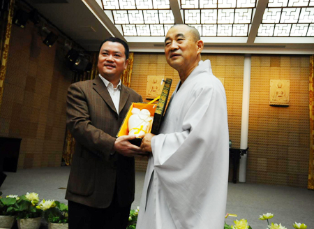 月真法师首先代表永福寺对韩国佛教天台宗朱正山长老以及各位长老的到来表示欢迎,并表示希望韩国天台宗把永福寺当作自己在杭州的家。陈振华副主任也对代表团访问杭州表示热烈的欢迎,希望韩国天台宗为促进中韩佛教的友谊、巩固和发展中韩佛教黄金纽带关系作出更大的贡献。随后,双方互赠了礼品。