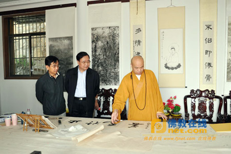 江苏省佛教协会副会长、徐州市佛教协会会长、兴化寺方丈果光法师在兴化寺江苏省源缘书画院热情接待了王秉山少将一行,并在白吕主任的提议下,当场泼墨分别为两位将军书写了 “止于至善”、“上善若水”的横幅。随后,果光法师陪同客人参观了唐宋摩崖石刻造像室、大雄宝殿、大佛殿和云龙山放鹤亭等景点,并向其讲解了大佛殿大佛头像的雕刻历史,客人对大佛头像的雕刻艺术赞叹不已。
