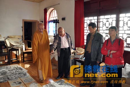 果光法师陪同参观了大佛殿、大雄宝殿、唐宋摩崖石刻造像室等殿堂。在方丈室,徐纯原先生观看了果光大和尚的近期书画作品,并予以很高的评价。