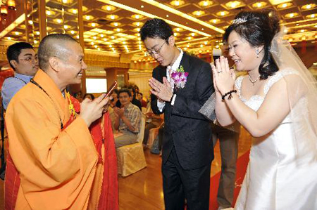 保定佛教转佛教在线台湾讯 2010年10月10日,佛光山台北道场举行佛化婚礼,邀请佛光山都监院院长慧传法师为新人方嘉庆、黄品轩福证,海内外30余位法师也到场祝福,新人充满法喜的接受百余位亲友及佛光人的祝福,圆满庄严的完成婚礼。