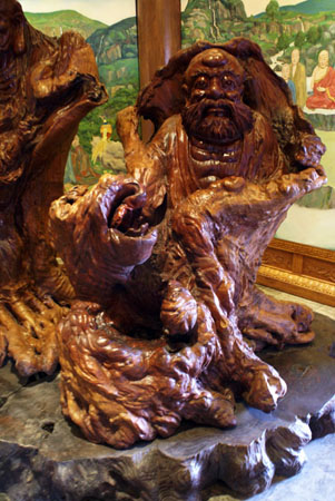 此次开放的第四层主题为“罗汉示迹”,主要展示佛教中罗汉独特的艺术造像,介绍佛教“正道修行、无常无我”的和谐思想,共藏有表现主题的三组大型艺术珍品:大型雕塑錾银高僧像、大型油画《正道图》、大型根雕罗汉。