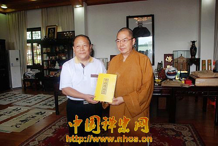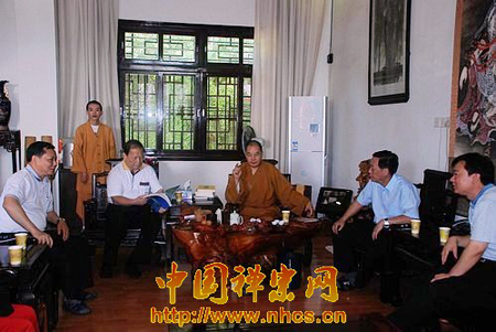 白志健主任一行认真参观了南华禅寺主要建筑和历代法宝文物。应传正法师的热情邀请,宾主双方在禅海岸方丈楼进行了亲切的座谈。传正法师通过图文并茂的《拈花笑处》一书,向客人简要介绍了禅宗的历史,以及南华禅寺的发展情况。交谈中,白志健主任首先向传正法师及全体僧众致以节日的问候,祝愿南华禅寺在各级政府的支持下,得到更好的传承和发展。