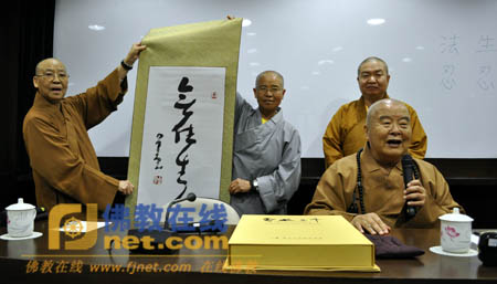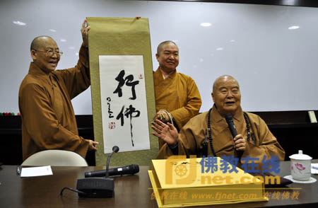 星云大师亲题三幅墨宝:“行佛”、“生忍法忍”、“无住生心”,分赠本英法师、悟法法师、颜修法师。
